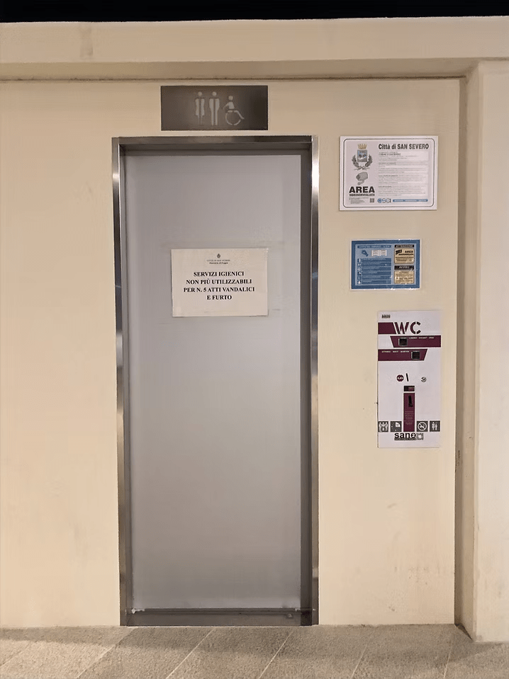 “Servizi igienici non più utilizzabili per n. 5 atti vandalici e furto”. Quella parola: più. Quel più ti dice che non potrai mai più utilizzare quel bagno. Ti dice che l’amministrazione non farà assolutamente nulla per renderlo nuovamente agibile. Un “bene” pubblico completamente abbandonato. Che scelta crudele. O infantile. O, forse, soltanto un errore di scrittura… e io mi sono fatta un gran film per niente? Tutto può essere.
